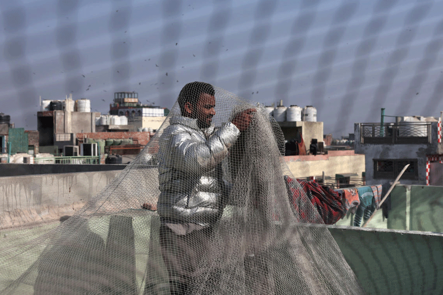 Azhar Udeen, 30, a kabootarbaaz (pigeon keeper) covers his terrace with a net before he lets out his new flock of pigeons to train and familiarise them with their new home, in the old quarters of Delhi.