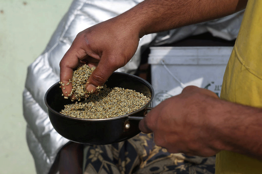 Azhar Udeen, 30, a kabootarbaaz (pigeon keeper) prepares a mixture of pearl millets to feed his pigeons at his home, in the old quarters of Delhi.