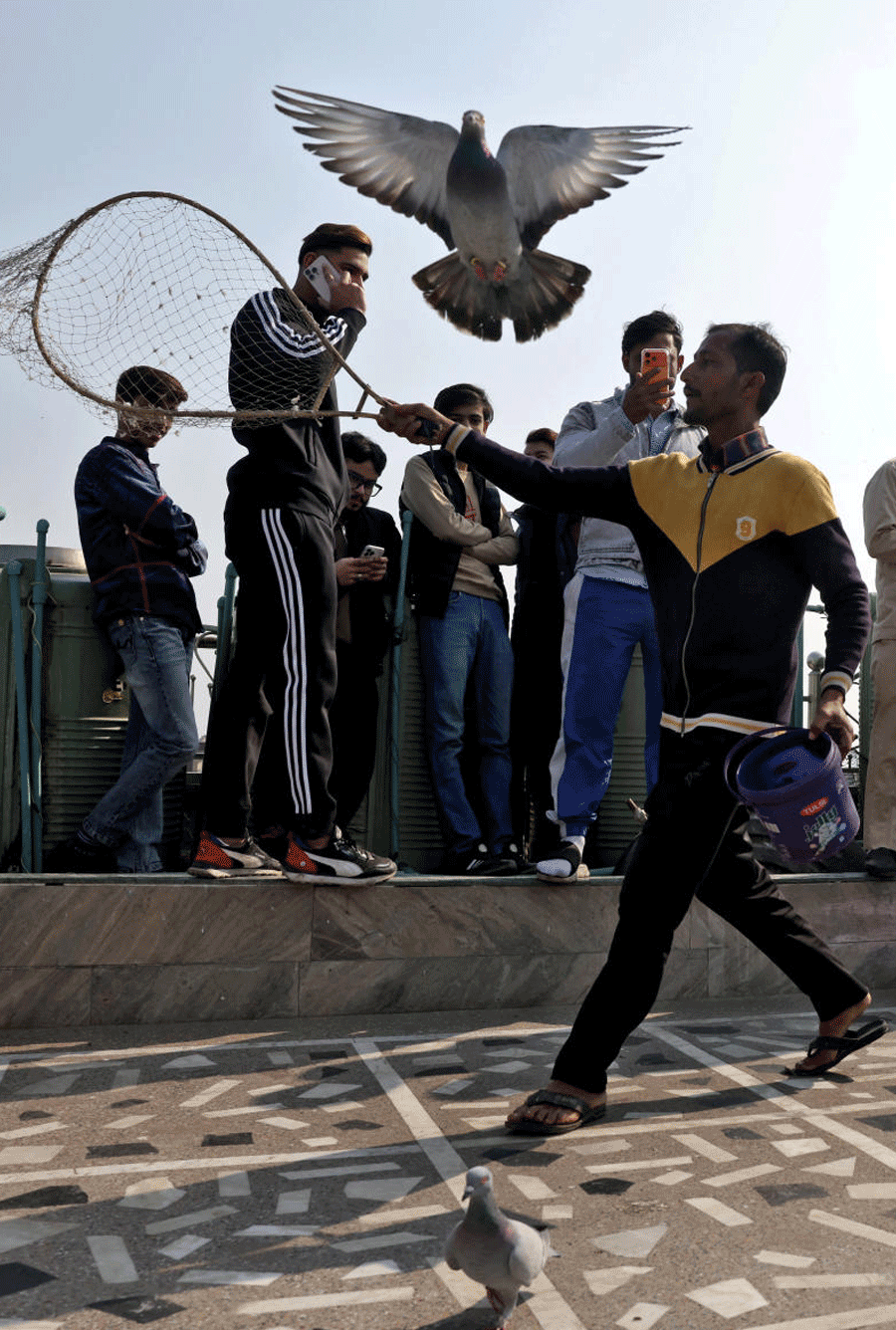 Mohammad Fizaan, a kabootarbaaz (pigeon keeper) scares away his pigeons, in Delhi.
