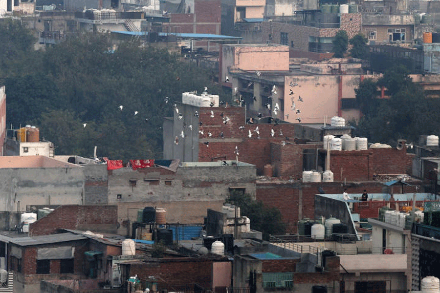 Pigeons fly over the rooftops of buildings in the old quarters of Delhi.