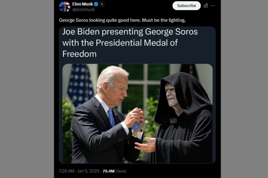 Musk posted a picture of President Biden handing over the Presidential Medal of Freedom to Darth Sidious of Star Wars. He equated Soros with Darth Sidious, a symbol of evil in the Star Wars franchise.