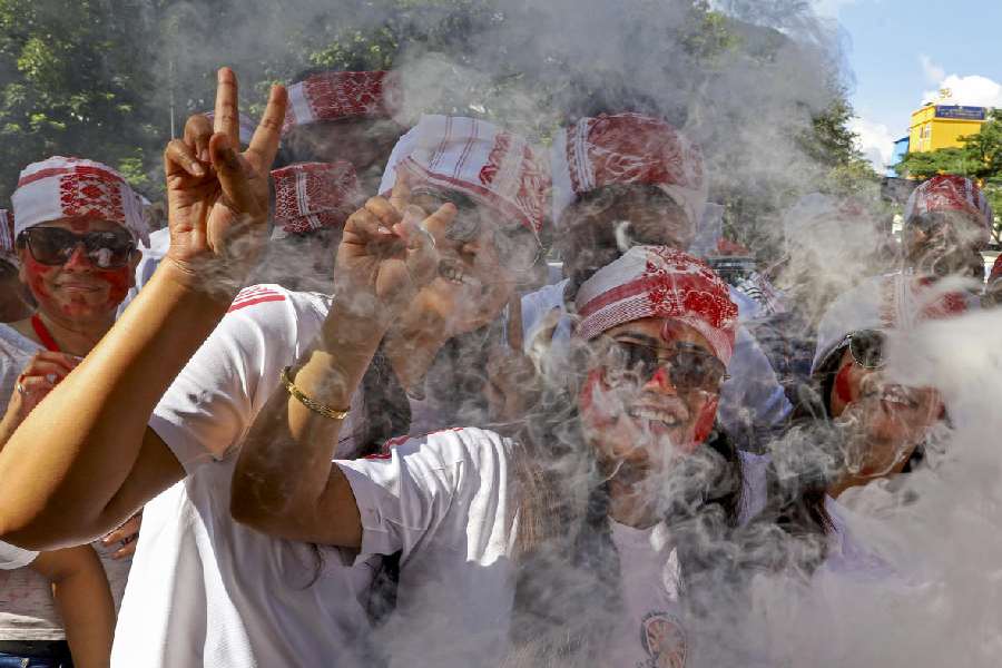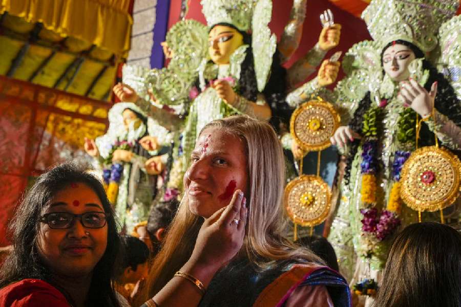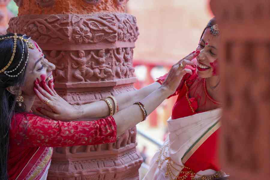 Women dressed in traditional white sarees with red borders participate in the Sindoor Khela, a ritual marking the end of Durga Puja where vermilion is smeared as a symbol of married women’s prayers for the long lives of their husbands and the goddess's blessings.