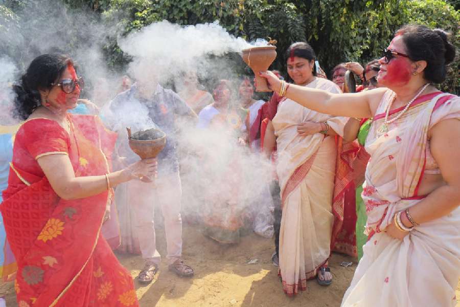 As part of the closing rituals of Vijaya Dashami, devotees perform the Dhunuchi dance while holding clay pots filled with burning incense. This dance is performed in front of the goddess’s idol to express devotion and gratitude.