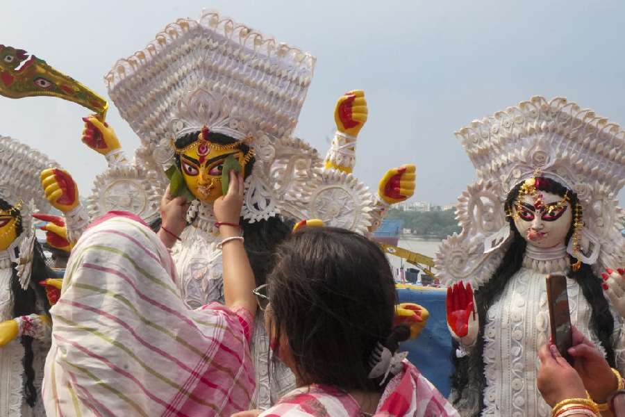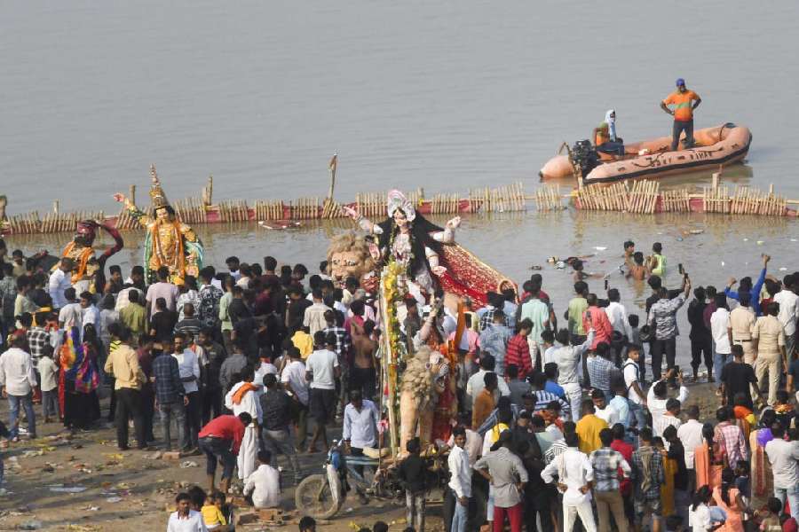Idols of Goddess Durga are prepared for immersion in the river, symbolizing her return to Mount Kailash, the home of her husband, Lord Shiva. The procession signifies the end of the festival as devotees pray for her safe journey.