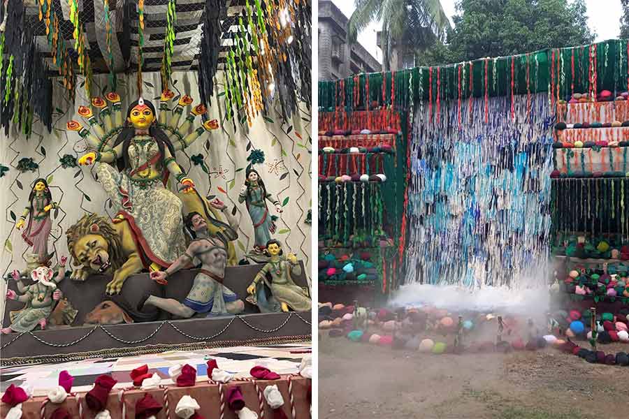 The women of Golf Green Sarod Utsav Committee have embraced sustainability with their theme Amader Prithavi, Amader Pujo (Our Earth, Our Puja). The pandal has been made using old clothes and recycled materials