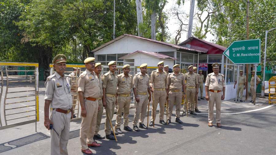 Police personnel stand guard as security has been beefed up outside Uttar Pradesh Chief Minister Yogi Adityanath's residence.