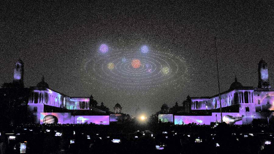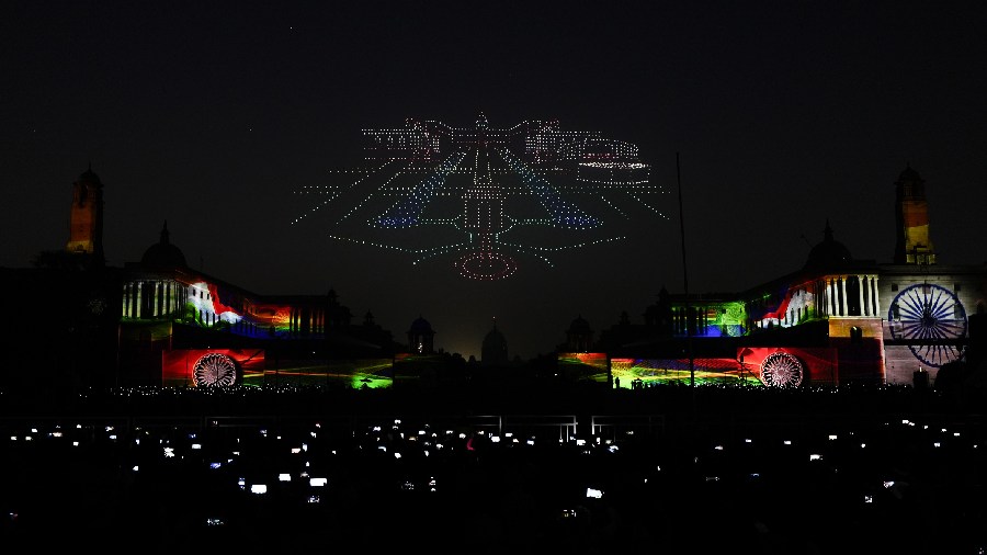 The magnificent drone show will light up the evening sky over the Raisina Hill, weaving myriad forms of national figures, events through smooth synchronisation.