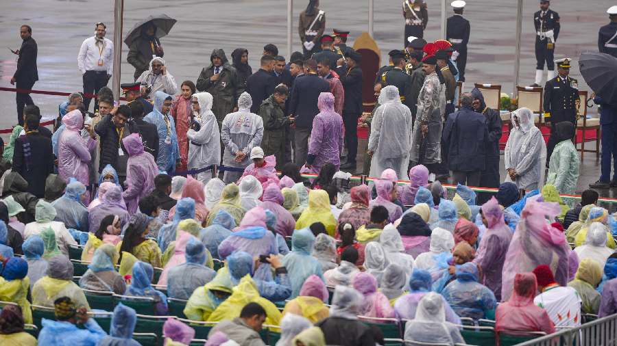 People wearing raincoats, sit to watch the Beating Retreat ceremony.