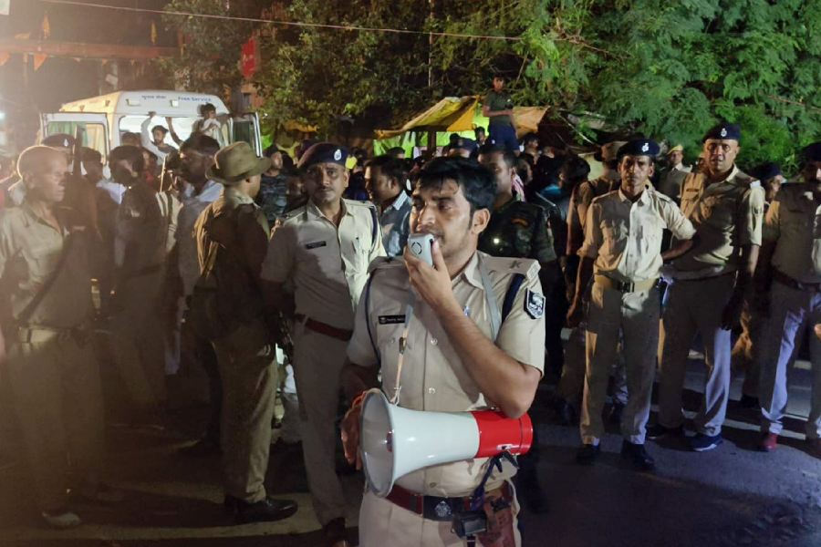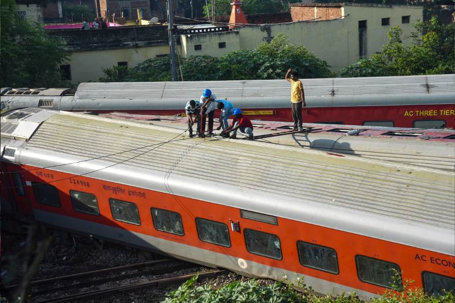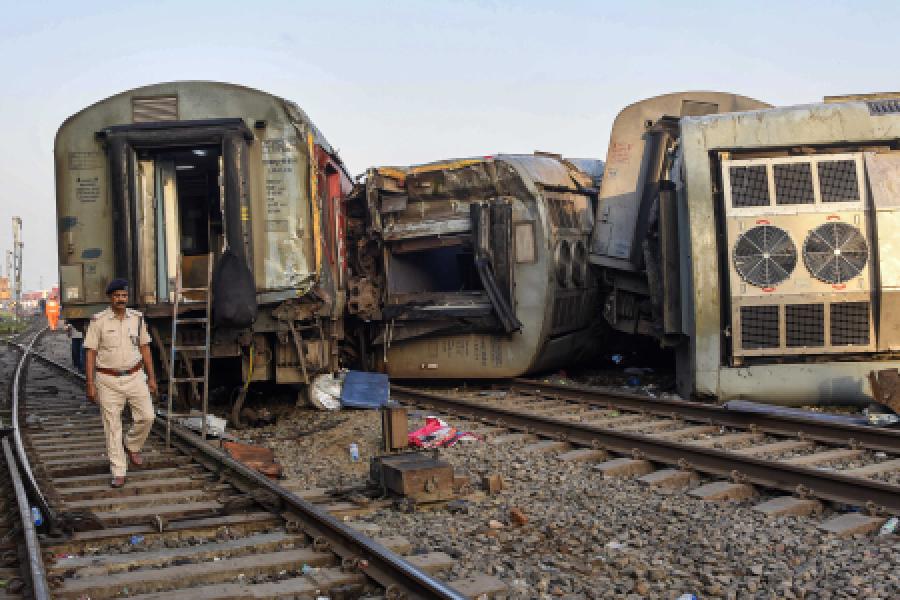 Police during rescue operation at the site of the accident after several bogies of North East Express derailed.