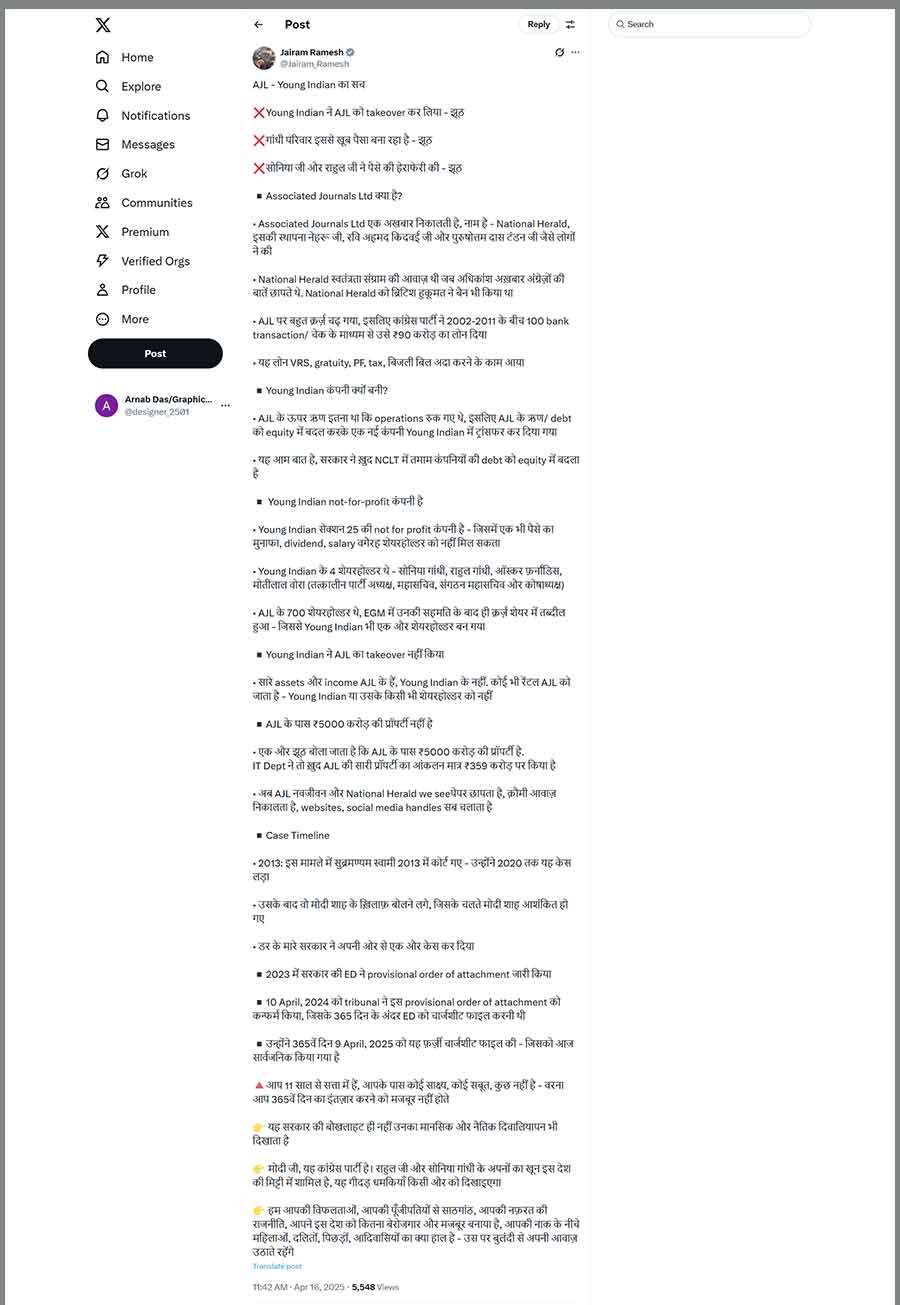 In another long post in Hindi, AICC general secretary Jairam Ramesh issued an explanation of the financial loan given to AJL, the company running National Herald, and termed as false the charges that Young Indian has taken over Rs 5,000 crore of properties of Associated Journals.