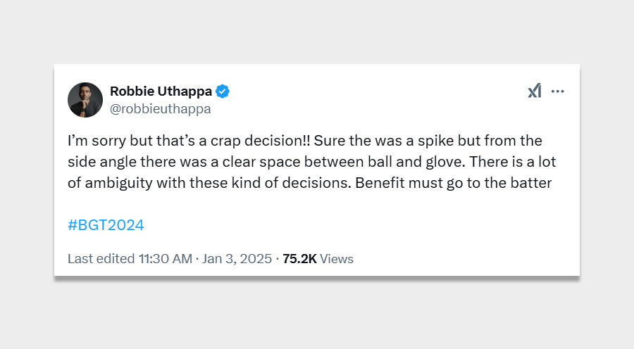 "I’m sorry, but that’s a crap decision! Sure, there was a spike, but from the side angle, there was a clear space between the ball and the glove. There is a lot of ambiguity with these kinds of decisions. The benefit must go to the batter," Uthappa wrote on X.
