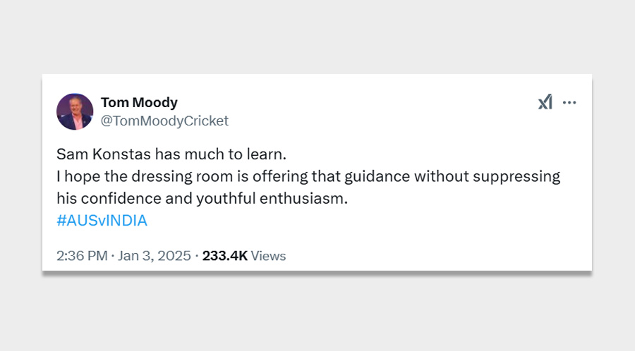 Former Australian cricketer turned coach Tom Moody said, “Sam Konstas has much to learn.