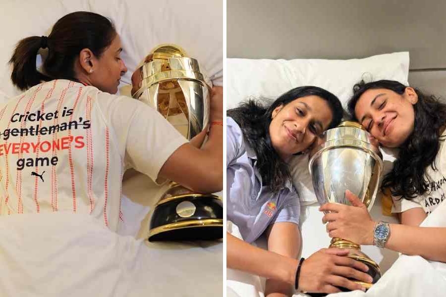 Hours later, a photo went viral of Harmanpreet, Smriti and Jemimah stepped on to the social media trend and posted pictures of sleeping with the trophy beside them.