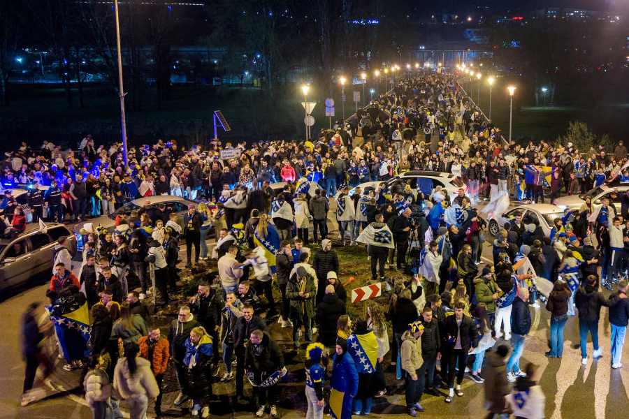 A drone view of Bosnia and Herzegovina fans celebrating qualifying for the FIFA World Cup outside the stadium after the match between Bosnia and Herzegovina v Italy, in Zenica, Bosnia and Herzegovina on April 1, 2026.