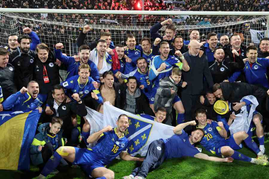Bosnia and Herzegovina players and staff celebrate qualifying for the FIFA World Cup at Bilino Polje Stadium, Zenica, Bosnia and Herzegovina on March 31, 2026.