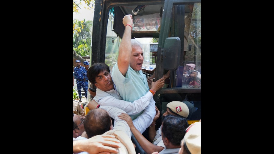 AAP MP Raghav Chadha being detained by police personnel during a protest against the questioning of Delhi Chief Minister Arvind Kejriwal by CBI, near the CBI headquarters in New Delhi.