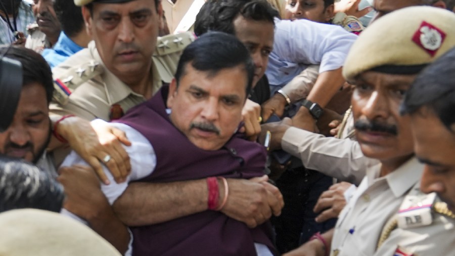 Here, in this picture, AAP MP Sanjay Singh can be seen being detained by police personnel.