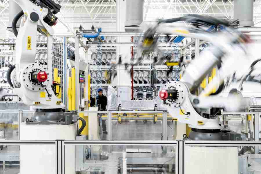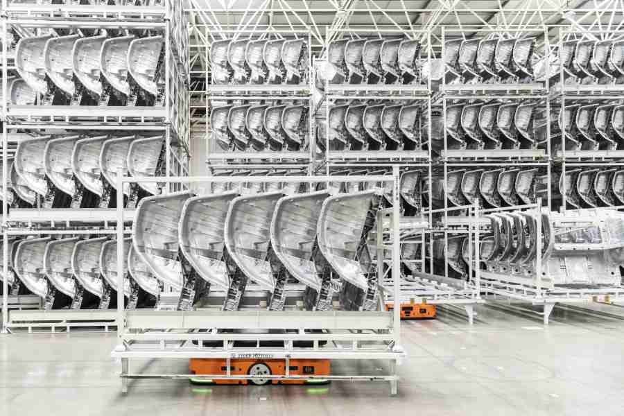 Cheerfully trilling Kenny G tunes to warn any people of their approach, robot carts haul aluminum ingots to an automated elevator, which lifts the blocks of metal to a furnace at the top of a 40-foot-tall Chinese-made machine. Once molten, the aluminum is cast into the shapes of various car body panels and other components. More robot carts, and the occasional human driving a forklift, take the components to a warehouse.