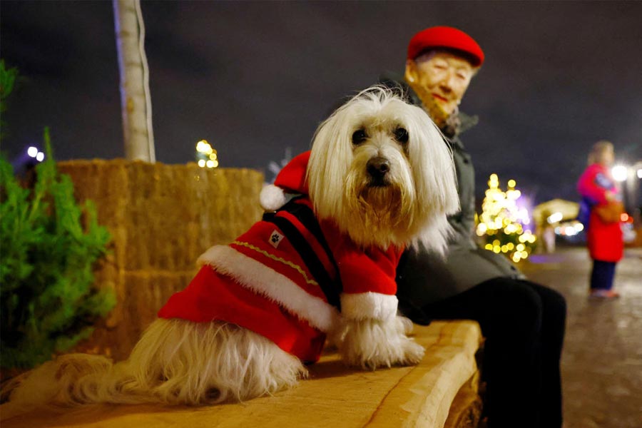 A dog dressed in a Santa Claus costume sits on a bench at the Christmas market of the Place de la Concorde in Paris, France as on December 18, 2024 (Reuters)