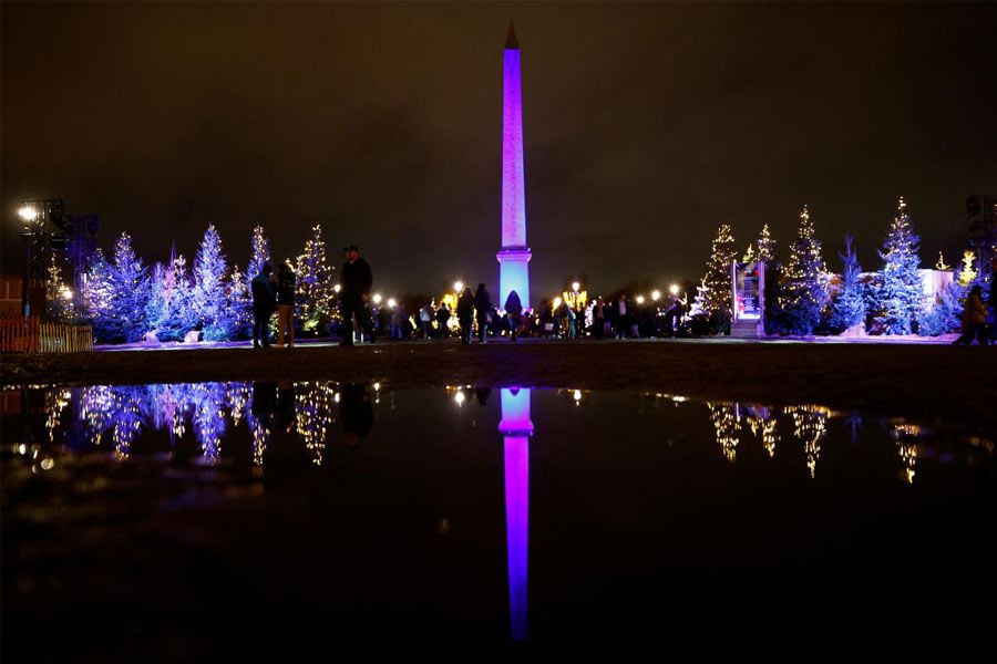 The Luxor Obelisk illuminated for Christmas season and decorated Christmas tree are reflected on a puddle at the Place de la Concorde in Paris, France as of December 18, 2024 (Reuters)