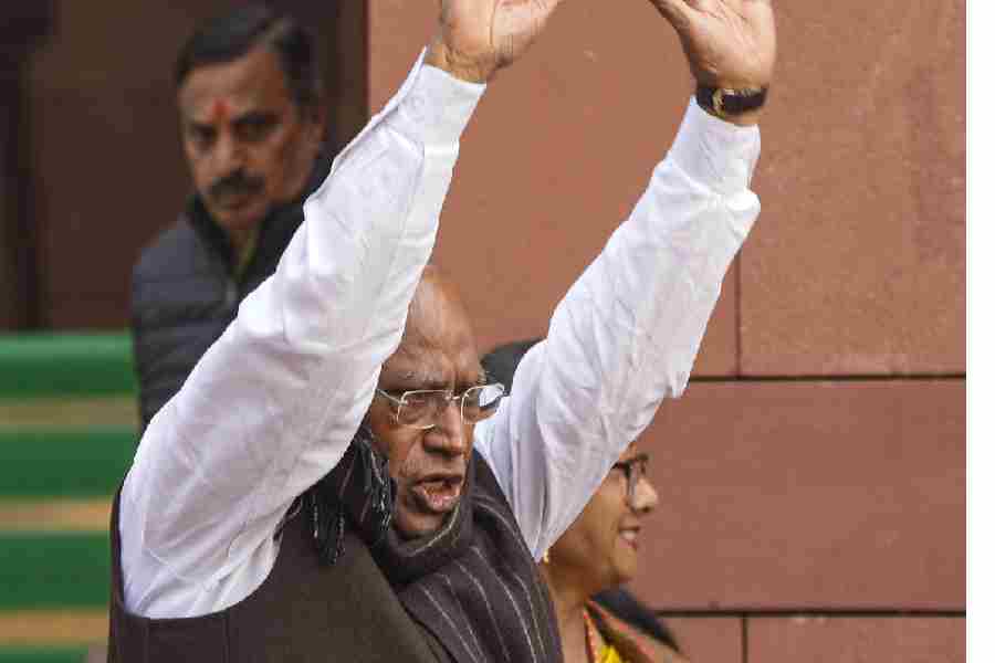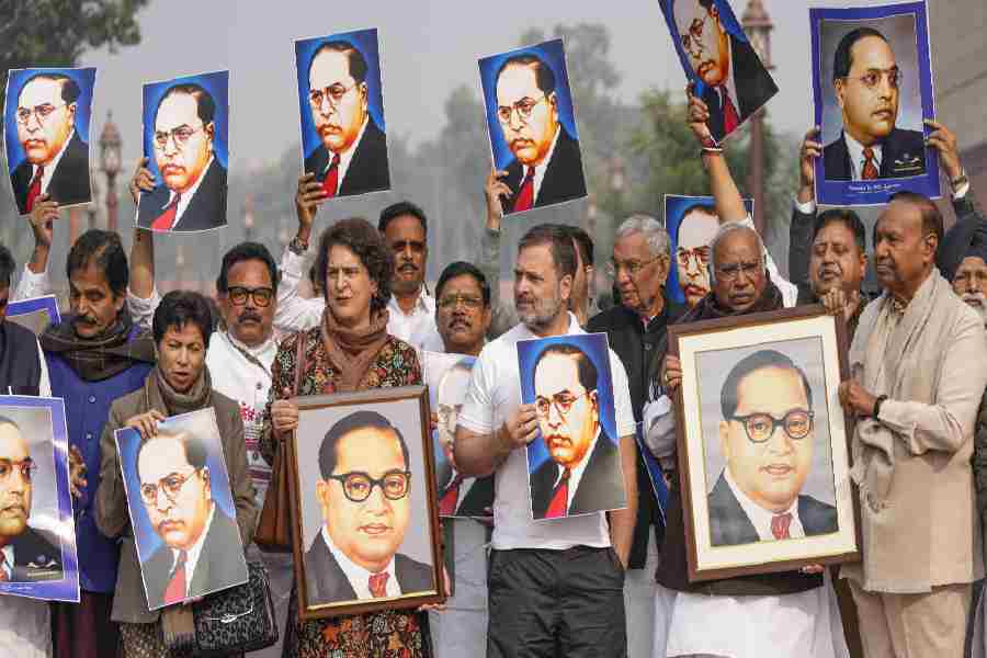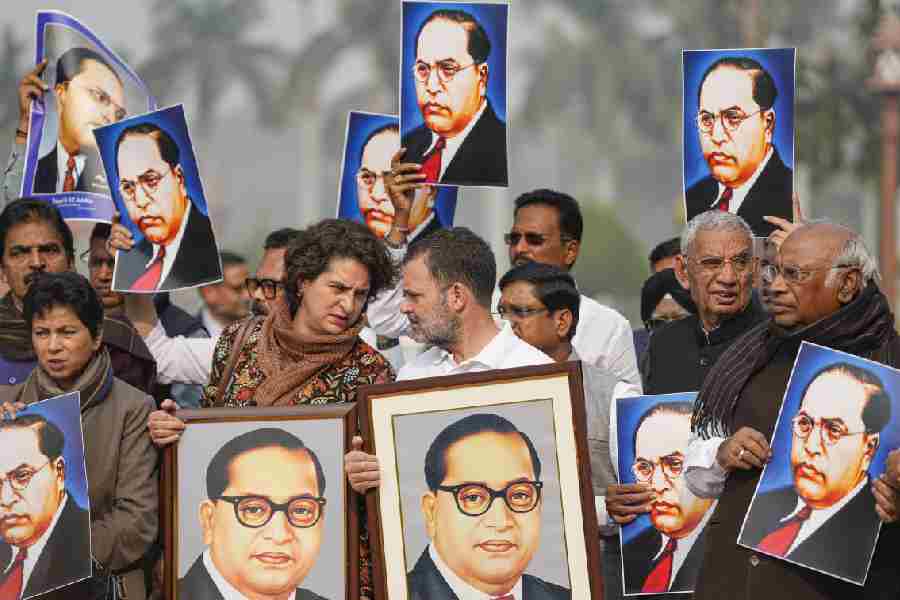 Leader of Opposition in the Lok Sabha Rahul Gandhi, Leader of Opposition in the Rajya Sabha Mallikarjun Kharge, Congress MPs Priyanka Gandhi Vadra, Kumari Selja and KC Venugopal and other opposition MPs hold portraits of Dr. BR Ambedkar during a protest amid the Winter session of Parliament, in New Delhi on Wednesday.