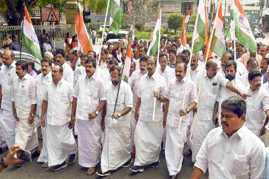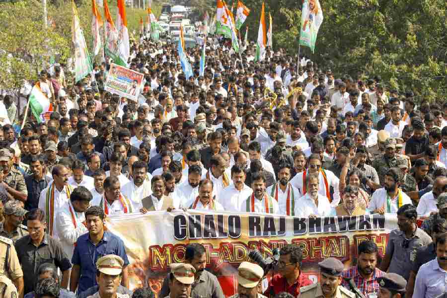 Leader of Opposition in the Kerala Assembly VD Satheesan, state Congress President K Sudhakaran and others took part in the ‘Chalo Raj Bhavan’ protest over Adani row, in Thiruvananthapuram on Wednesday.
