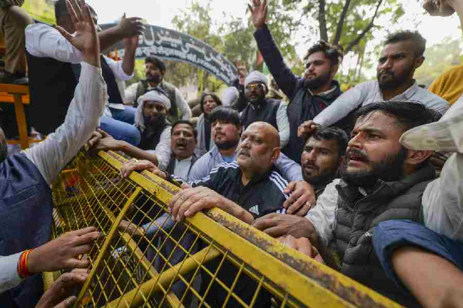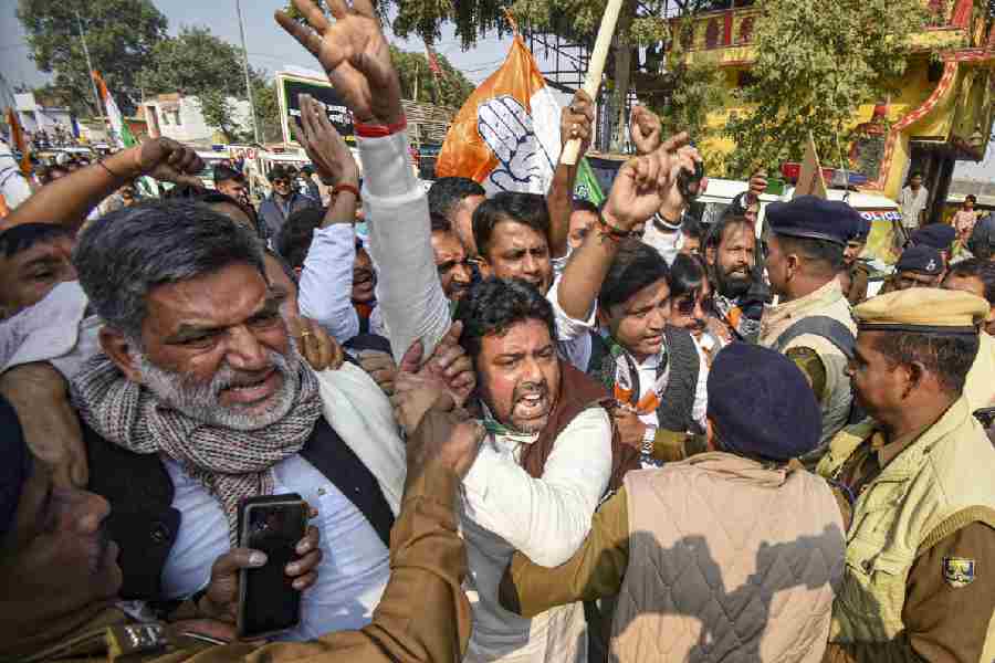 In Patna, police personnel tried to stop Congress workers and supporters during their protest march to Raj Bhavan over the indictment of industrialist Gautam Adani by a US court in a bribery case, on Wednesday,