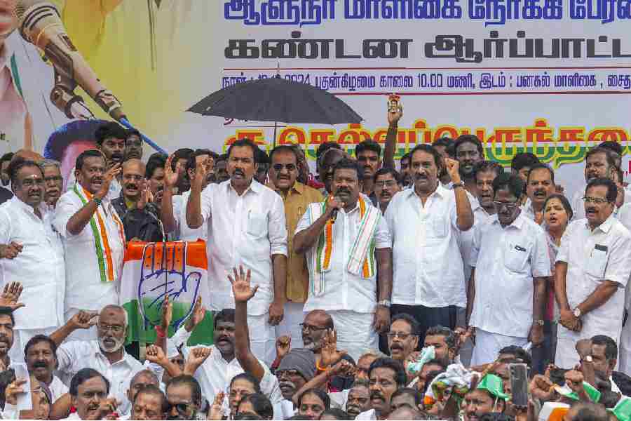 Tamil Nadu Congress Committee President K Selvaperunthagai with party leaders and workers also protested as part of the nationwide demonstration to highlight several issues, including BJP's policy to "defend" Gautam Adani, in Chennai on Wednesday.