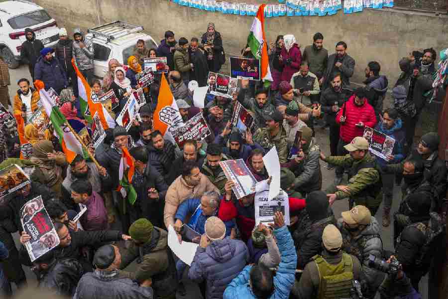 In Srinagar also, police personnel try to stop Congress workers from marching to the Raj Bhavan as part of the nationwide demonstration to highlight several issues, including BJP's policy to "defend" Gautam Adani, restoration of statehood to J-K, and the Manipur issue, on Wednesday,