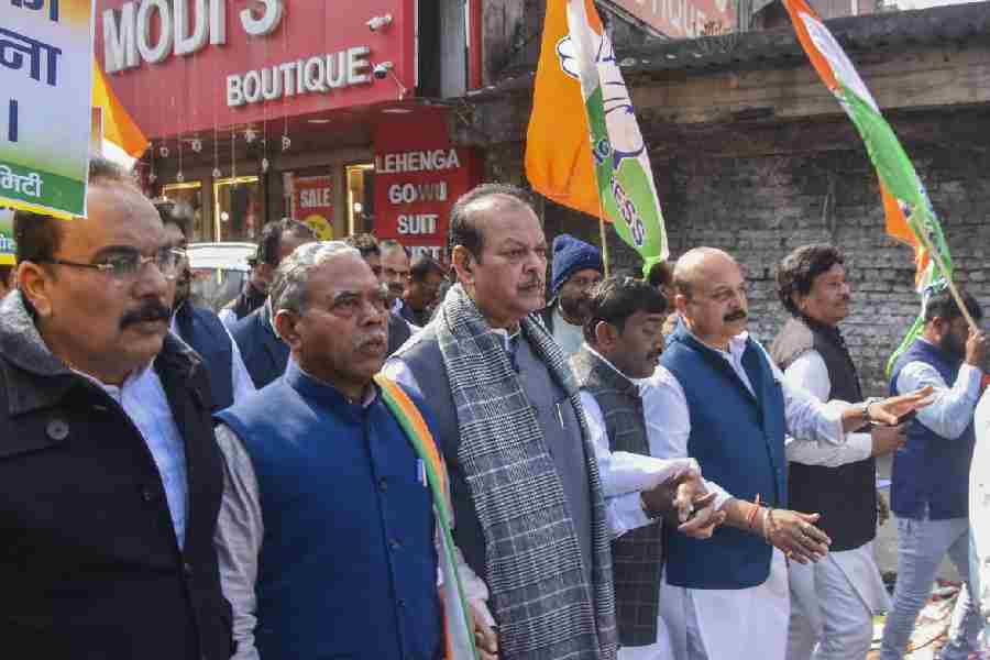Jharkhand Congress President Keshav Mahto with party leader Subodh Kant Sahay and other party leaders and workers marched to the Raj Bhavan as part of the nationwide demonstration to protest against the Centre over the indictment of industrialist Gautam Adani by a US court in a bribery case and Manipur issue, in Ranchi on Wednesday,