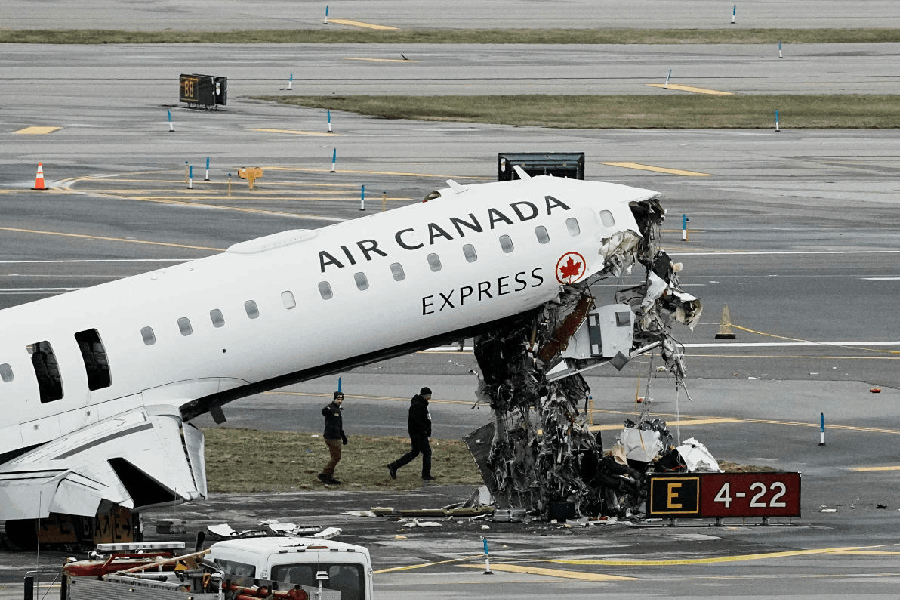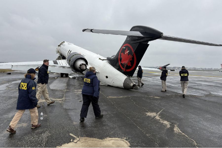 Personnel of the National Transportation Safety Board (NTSB) inspect the wreckage of an Air Canada Express jet that collided with a fire truck at New York's LaGuardia Airport in Queens, New York, U.S., March 23, 2026. (Reuters)