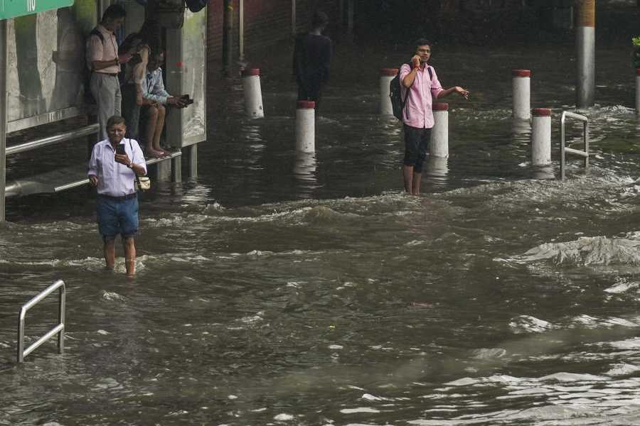 Commuters wait at a waterlogged bus stop, their travel plans delayed by the relentless rain. The waterlogging has left many bus stops submerged and inaccessible.