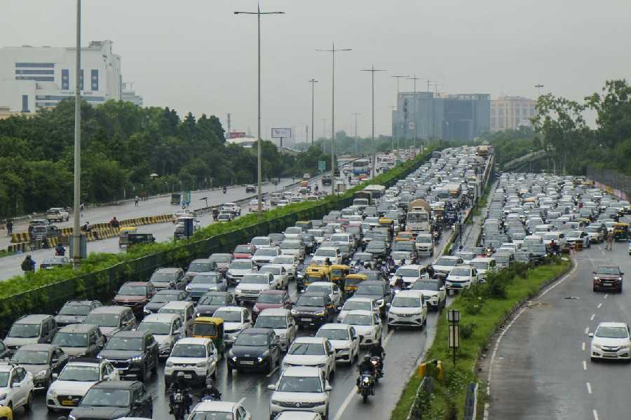 Traffic comes to a standstill on the Delhi-Gurugram Expressway near Rajiv Chowk due to the heavy rains.