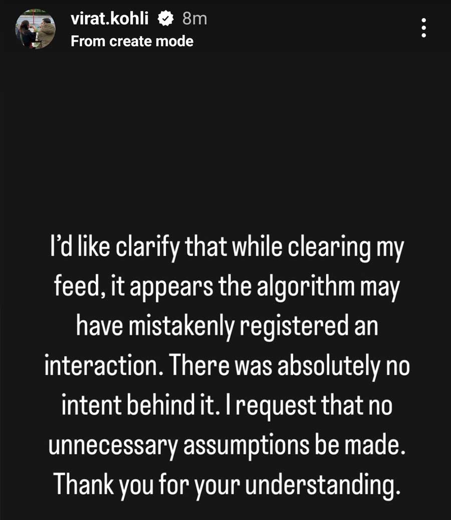 Kohli said: “I’d like to clarify that while clearing my feed, it appears the algorithm may have mistakenly registered an interaction… There was absolutely no intent behind it.”