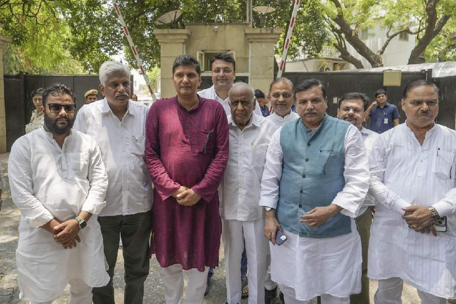 AAP leaders Sanjay Singh and Saurabh Bhardwaj with other party leaders outside Delhi Lieutenant Governor VK Saxena's residence after a meeting regarding the ongoing water crisis in the national capital, in New Delhi, Sunday, June 23, 2024. A delegation of the Aam Aadmi Party (AAP) met Delhi Saxena and said they were assured that the matter would be taken up with the Haryana government.