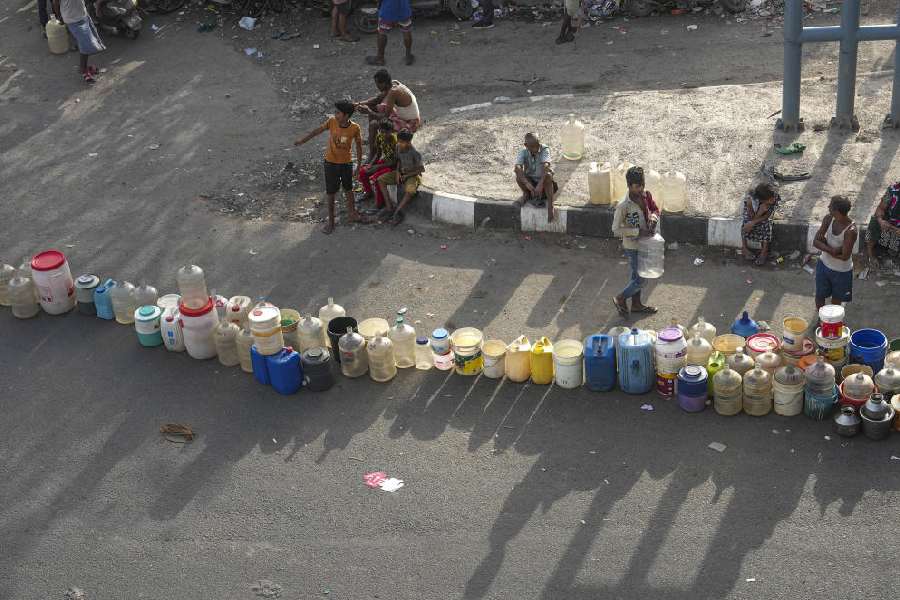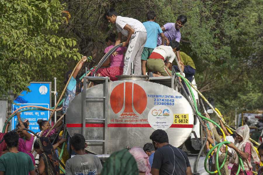 People wait to collect drinking water from a tanker of Delhi Jal Board on a hot summer day as water crisis continues, at a slum in Geeta Colony area, in East Delhi, Saturday, June 15, 2024. Delhi is dependent on Uttar Pradesh and Haryana for the supply of drinking water.
