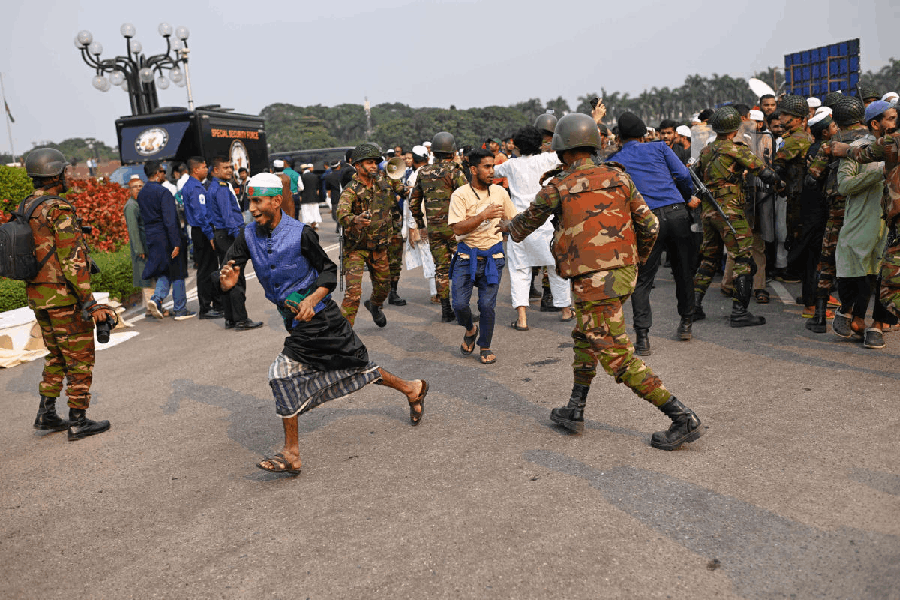 Security forces control a group of people who arrived to participate in the funeral prayers for leading Bangladeshi activist Sharif Osman Hadi, who died from gunshot wounds sustained in an attack in Dhaka earlier this month, in Dhaka, outside the nation's Parliament complex in Dhaka, Bangladesh, Saturday, Dec. 20, 2025. (AP/PTI)