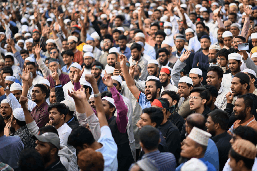 People shout slogans as they gather to perform funeral prayers for leading Bangladeshi activist Sharif Osman Hadi, who died from gunshot wounds sustained in an attack in Dhaka earlier this month, outside the nation's Parliament complex in Dhaka, Bangladesh, Saturday, Dec. 20, 2025. (AP/PTI)