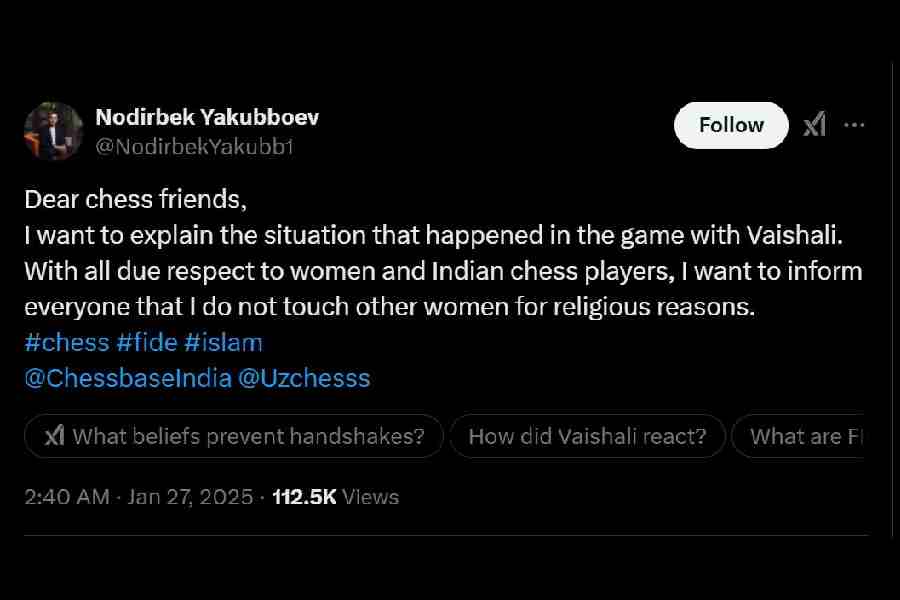 A viral social media clip shows Vaishali extending her hand before her fourth-round contest against Yakubboev. But the Uzbek refused to do so, waved his hand and sat down without responding to Vaishali.