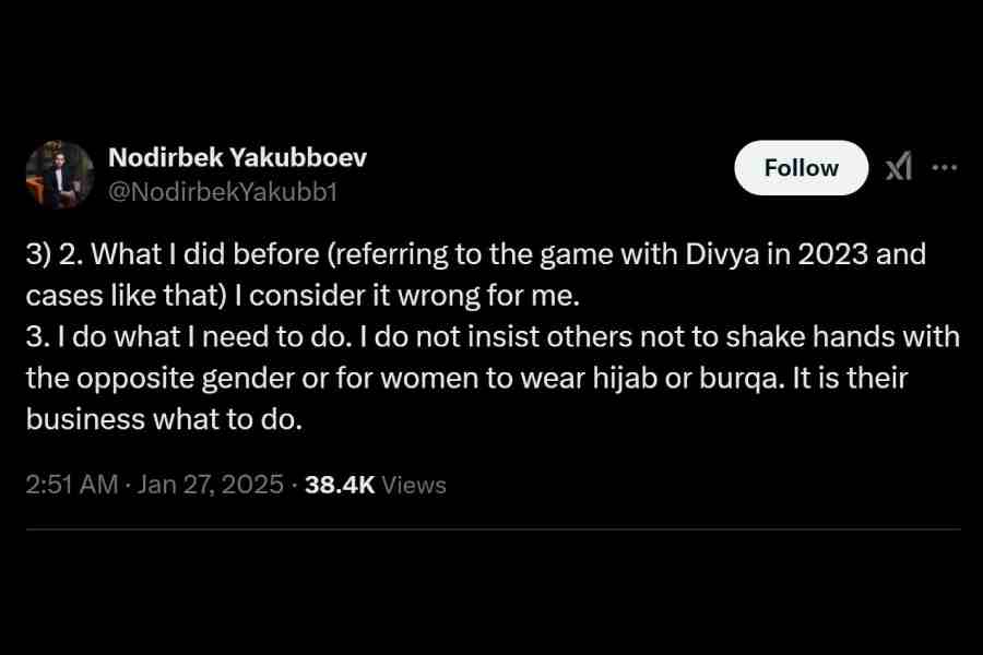 “2. What I did before (referring to the game with Divya in 2023 and cases like that) I consider it wrong for me. 3. I do what I need to do. I do not insist others not to shake hands with the opposite gender or for women to wear hijab or burqa. It is their business what to do,” he added.