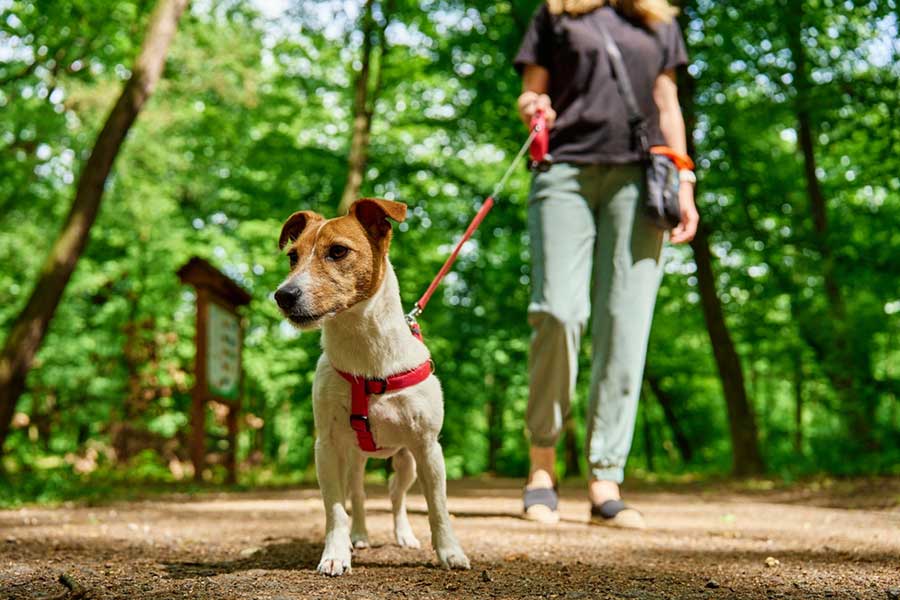 Maxson suggests using a non-retractable leash of 6 to 8 feet (1.8 to 2.4 meters). “Longer leashes are more likely to get tangled around your legs and cause falls. Retractable leashes can sometimes make your dog more difficult to control."