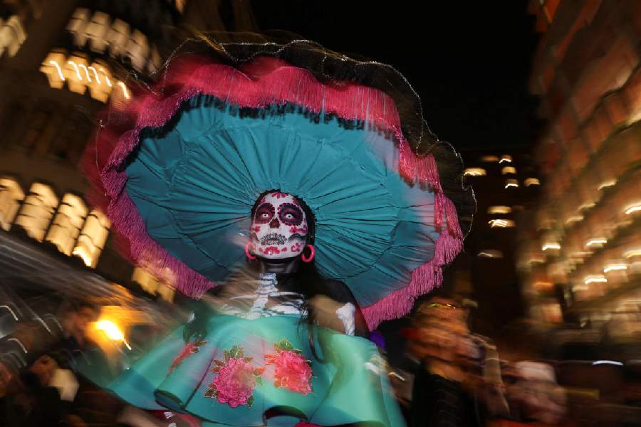 A woman performs during the annual NYC Halloween Parade in Manhattan in New York City, U.S., October 31, 2024.