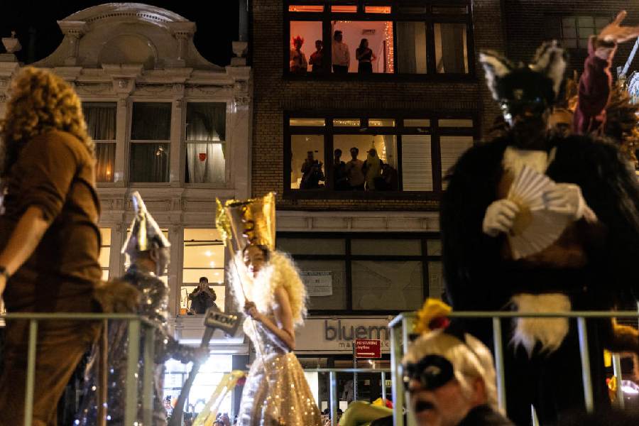 People watch from the windows during the annual NYC Halloween Parade in Manhattan, New York City, U.S., October 31, 2024.