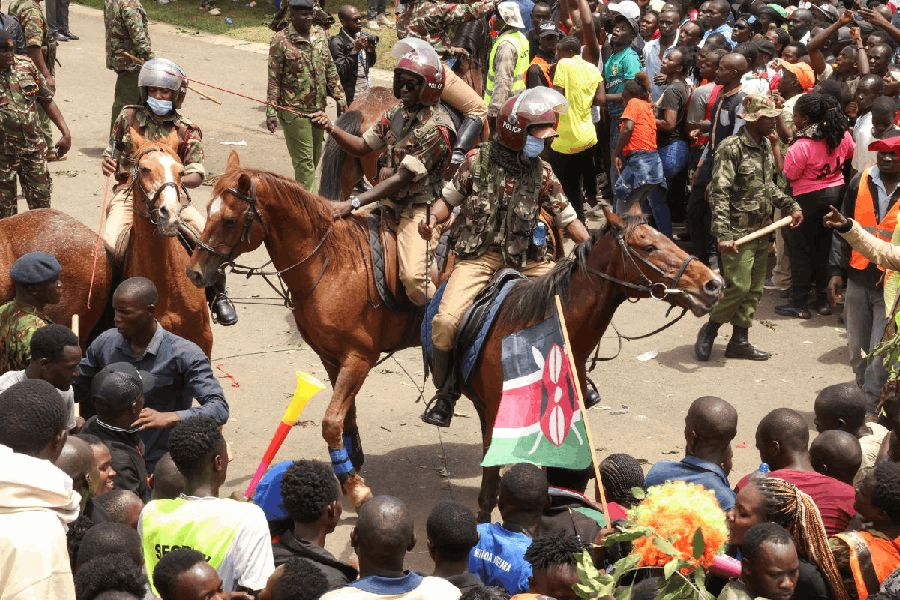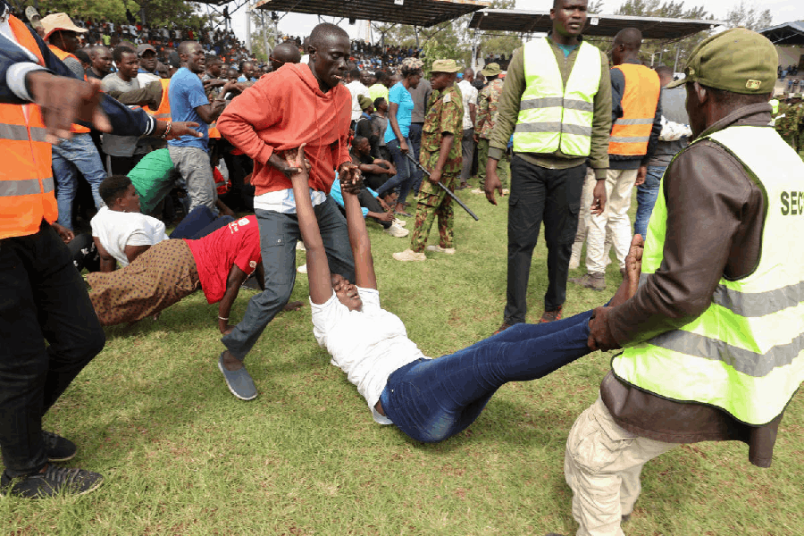 Large crowds of people could be seen crying, waving Kenyan flags and at one point pushing one another in a scuffle at the Jomo Kenyatta Stadium in Kisumu.