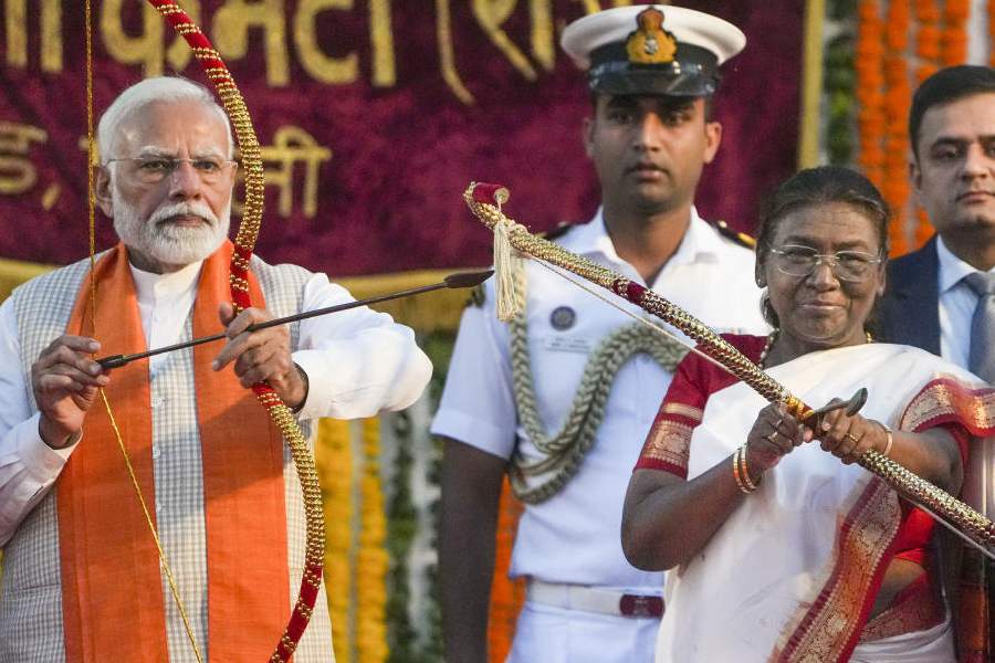 President Droupadi Murmu and PM Modi hold bow and arrow during celebration of the ‘Dussehra’ (Vijayadashami) festival organised by Shri Dharmik Leela Committee, at Parade Ground of the Red Fort, in New Delhi, Saturday, Oct. 12, 2024.