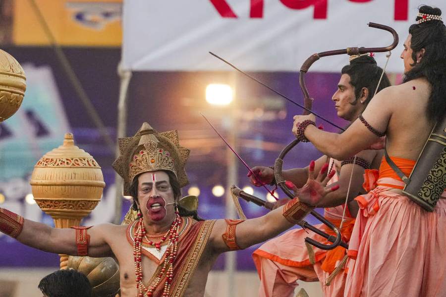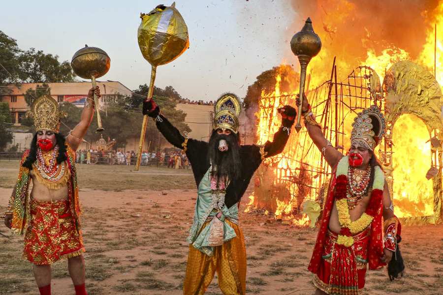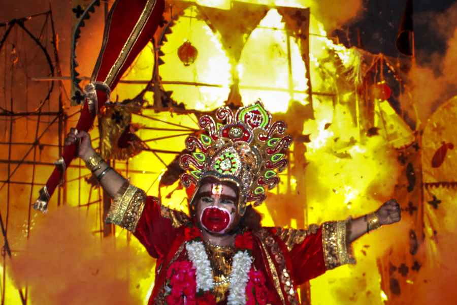 Ramleela actors perform during celebration of the ‘Dussehra’ (Vijayadashami) festival organised by Shri Dharmik Leela Committee, at Parade Ground of the Red Fort, in New Delhi, Saturday, Oct. 12, 2024.