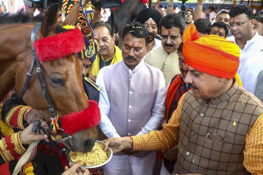 Madhya Pradesh CM Mohan Yadav during 'Ashwa Puja' on the occasion of Vijaya Dashami festival, in Indore, Saturday, Oct. 12, 2024.