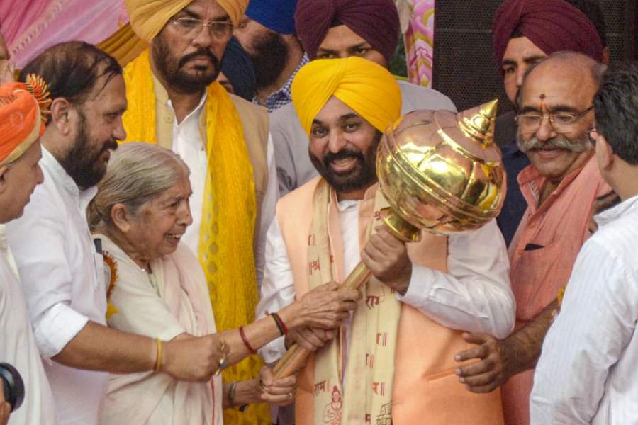 Punjab CM Bhagwant Maan along with Durgiana Temple President Laxmi Kanta Chawala and others during Dusshera festival celebration, in Amritsar, Saturday, Oct. 12, 2024.