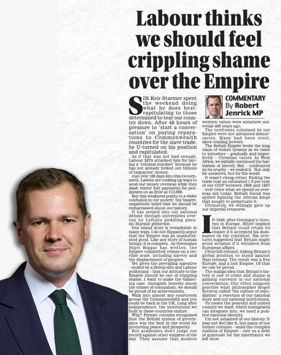 “Given the prevailing narrative – stoked by a liberal elite and Labour politicians – that our attitude to the Empire should be one of crippling shame, I want to make the balancing case. Alongside honesty about the crimes of colonialism, we should be proud of its achievements,” he asserted.