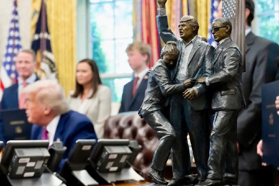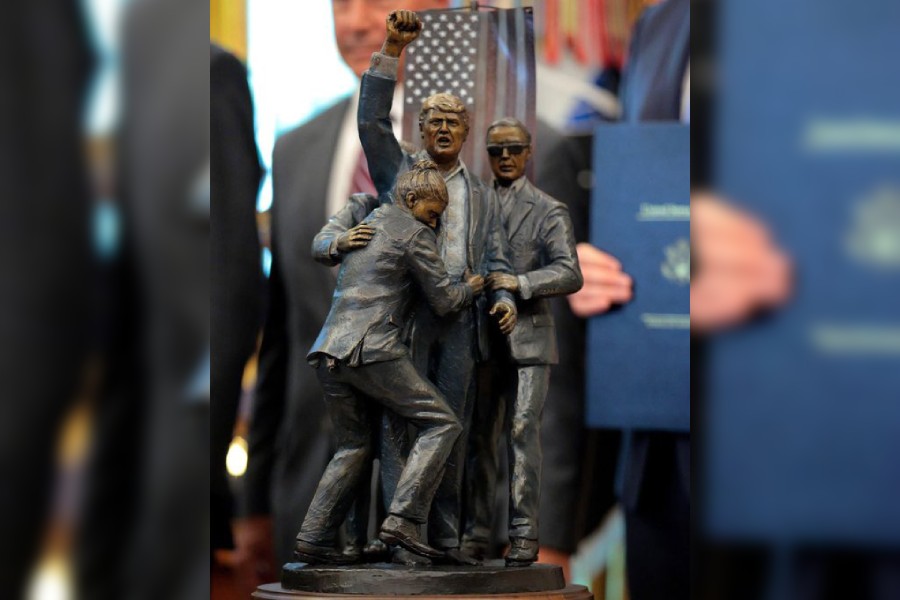 US President Donald Trump has installed a new art piece at the Oval Office - a statue depicting the aftermath of the July 2024 assassination attempt against him in Butler, Pennsylvania.